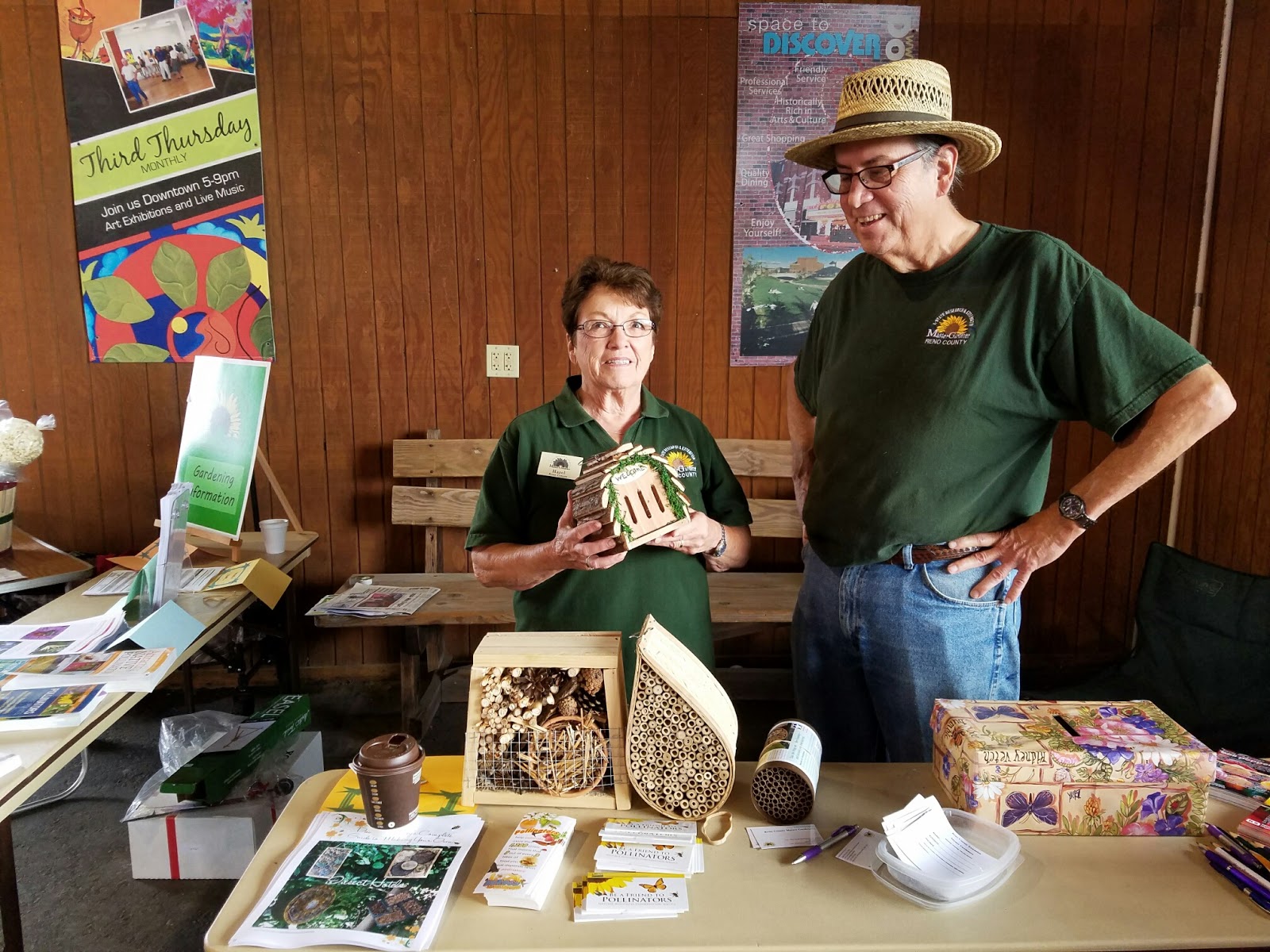 Zink & Bob Roubideaux at the Reno County Master Gardener's booth at Saturday's Farmer's Market. Their booth displayed some simple shelters and other devices to aid and encourage more homeowners to assist in countering the depletion of the natural habit of pollinators, such as installing houses for bats or native bees.